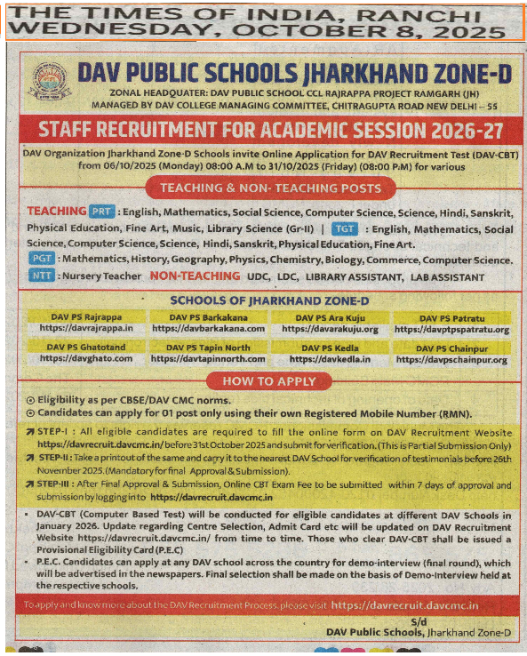 Managed By DAV College Management Trust & Society, New Delhi-55 C/o DAV Public School, RAJRAPPA PROJECT CCL Distt – Ramgarh (JH) Pin: 829150